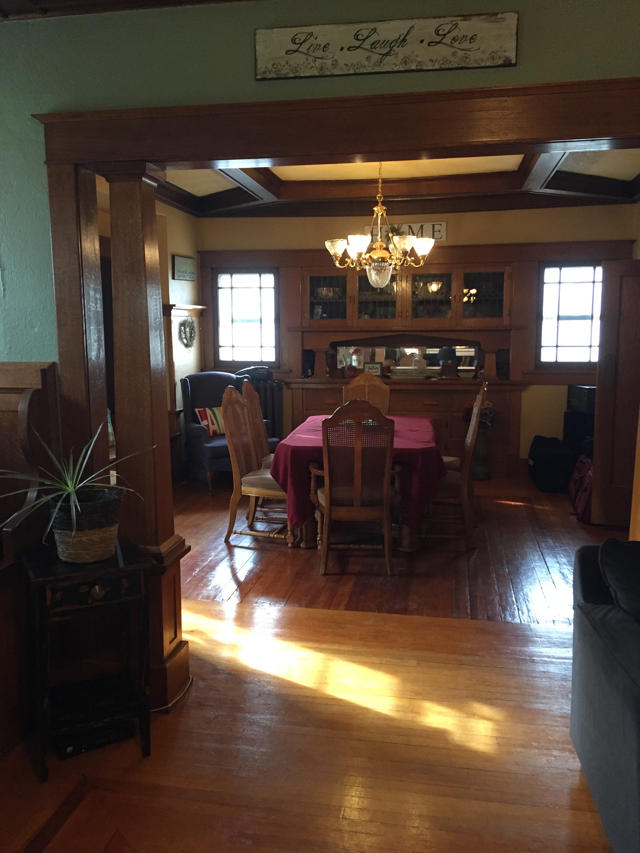 hutch, window seat and wood floors.