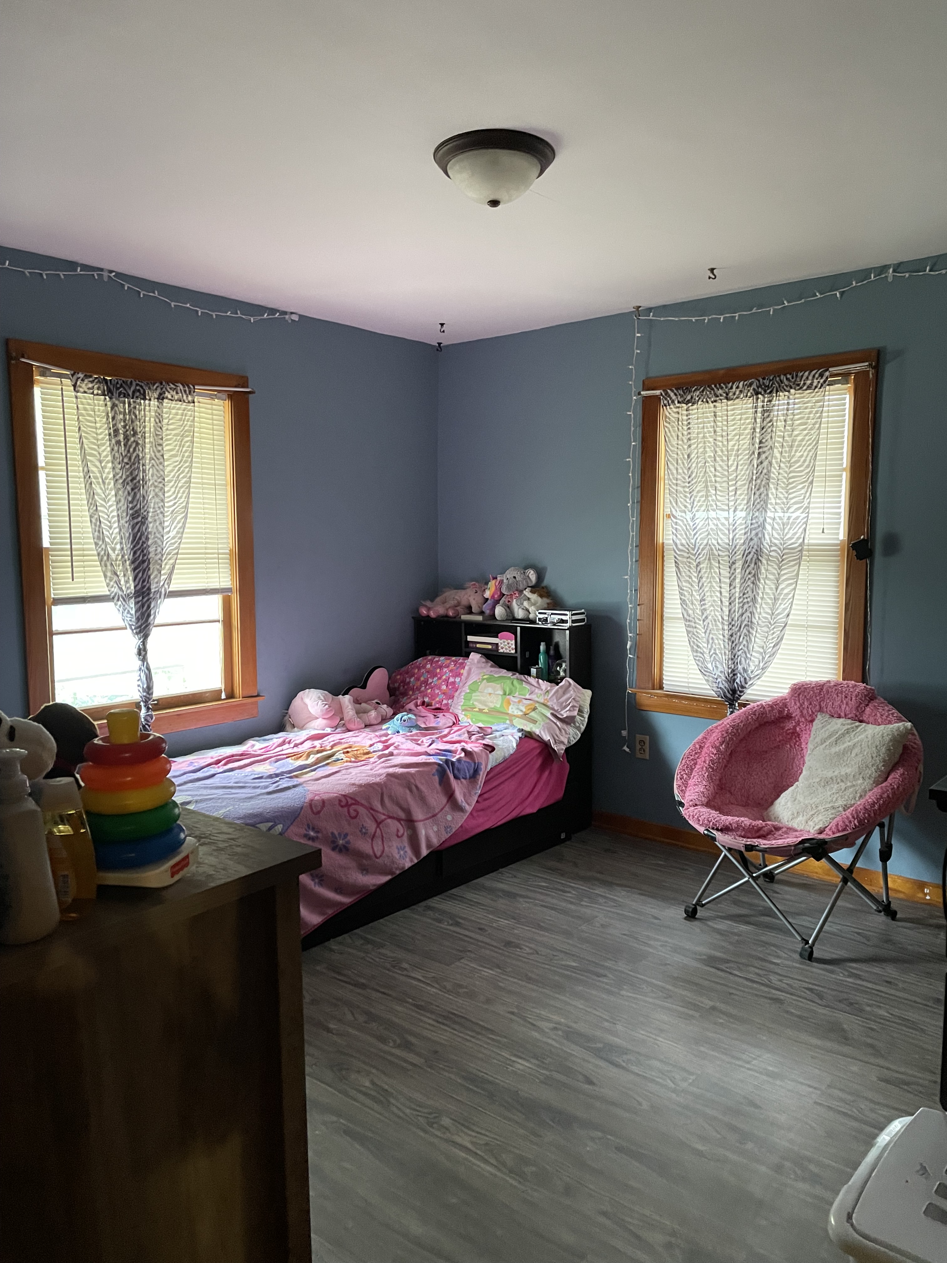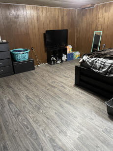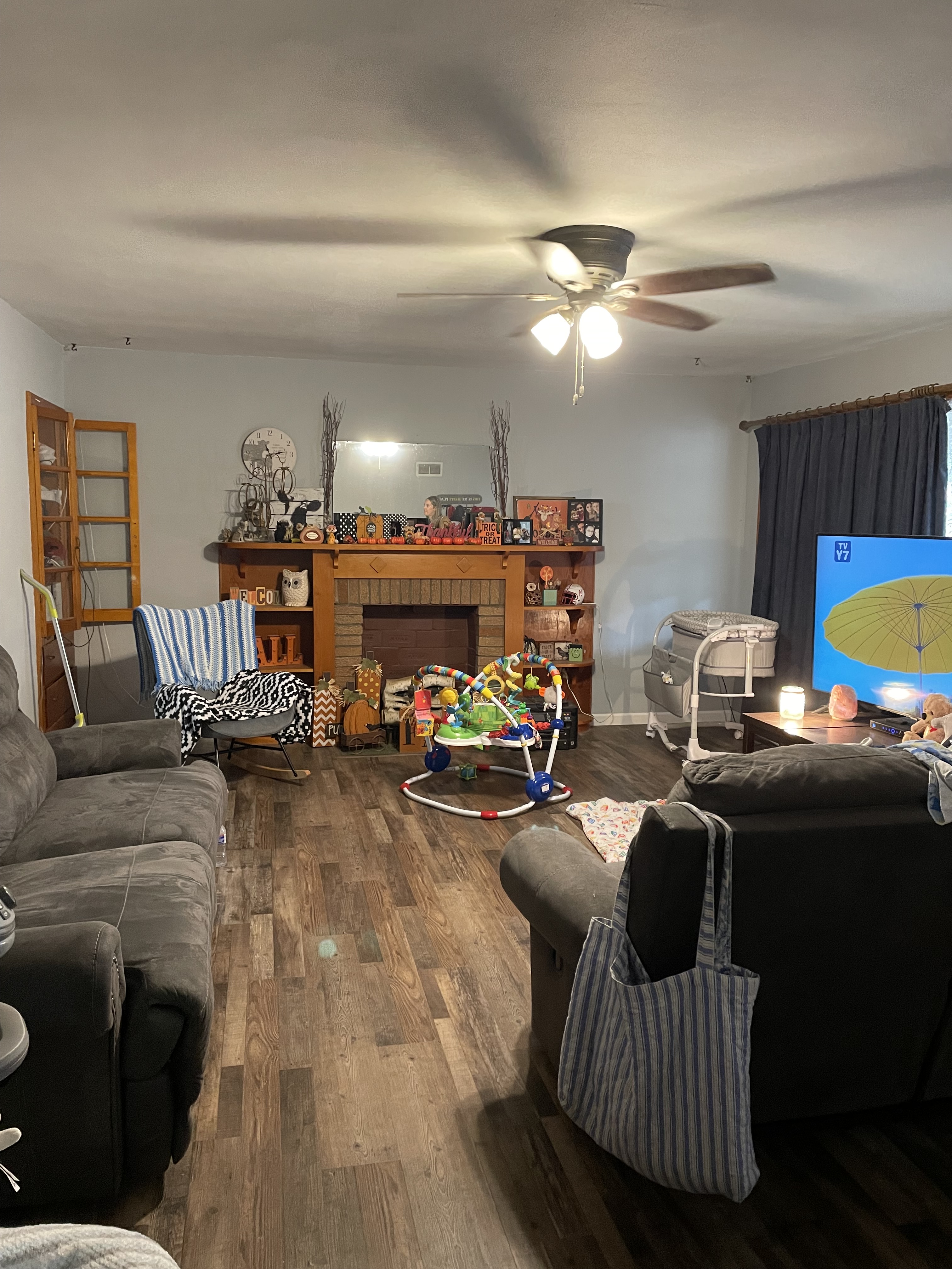 window, fireplace and new flooring.